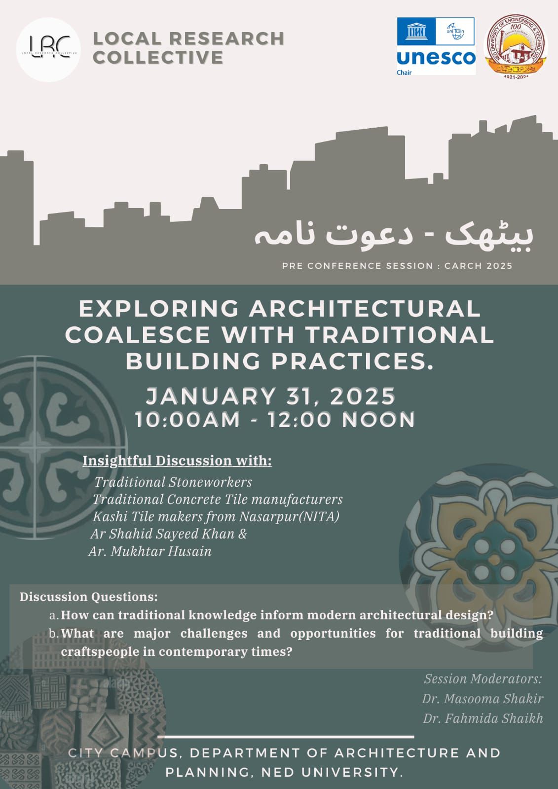 Baithak – “Exploring Architectural Coalesce with Traditional building and Ornamentation practices”, a Roundtable Discussion organized by Dr. Masooma Shakir and Dr. Fahmida Shaikh, inviting people from the industry of traditional building crafts, along with their product samples. Funded by Terrazzo and Concrete Technologies (TACT). Held on 31st January 2025, as a pre-conference session to 2nd International Conference on Architecture at Department of Architecture and Planning, NED University of Engineering and Technologies. |