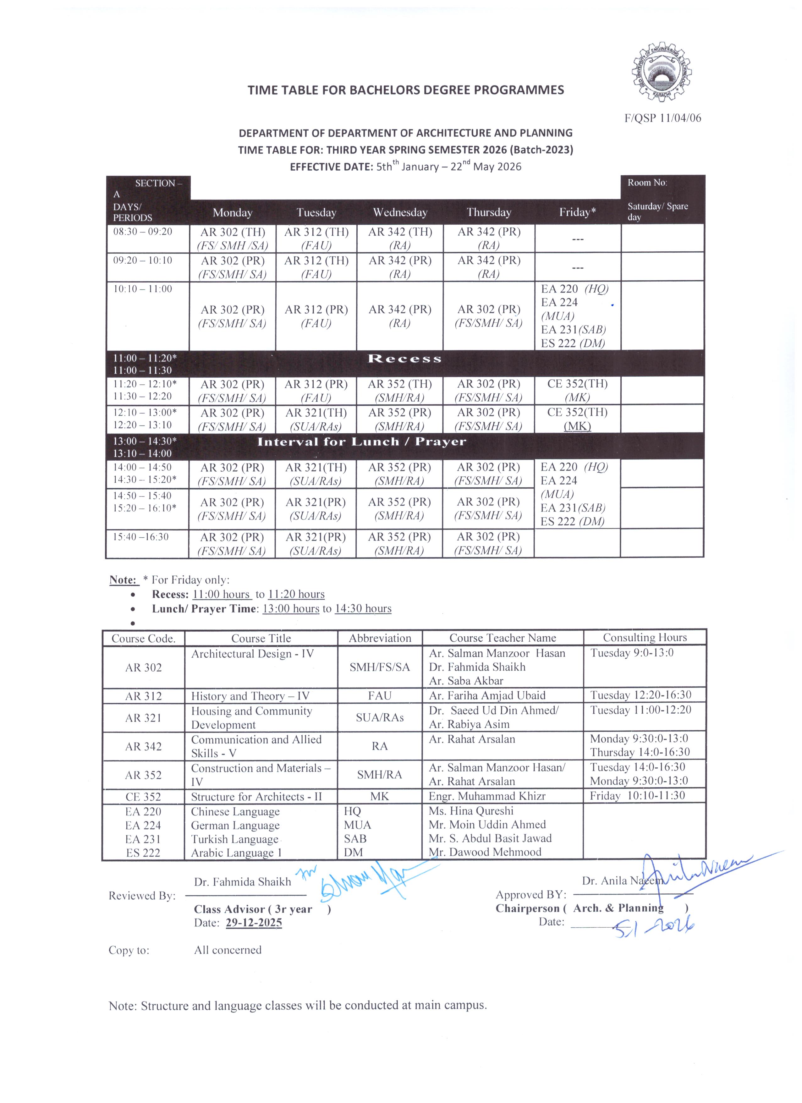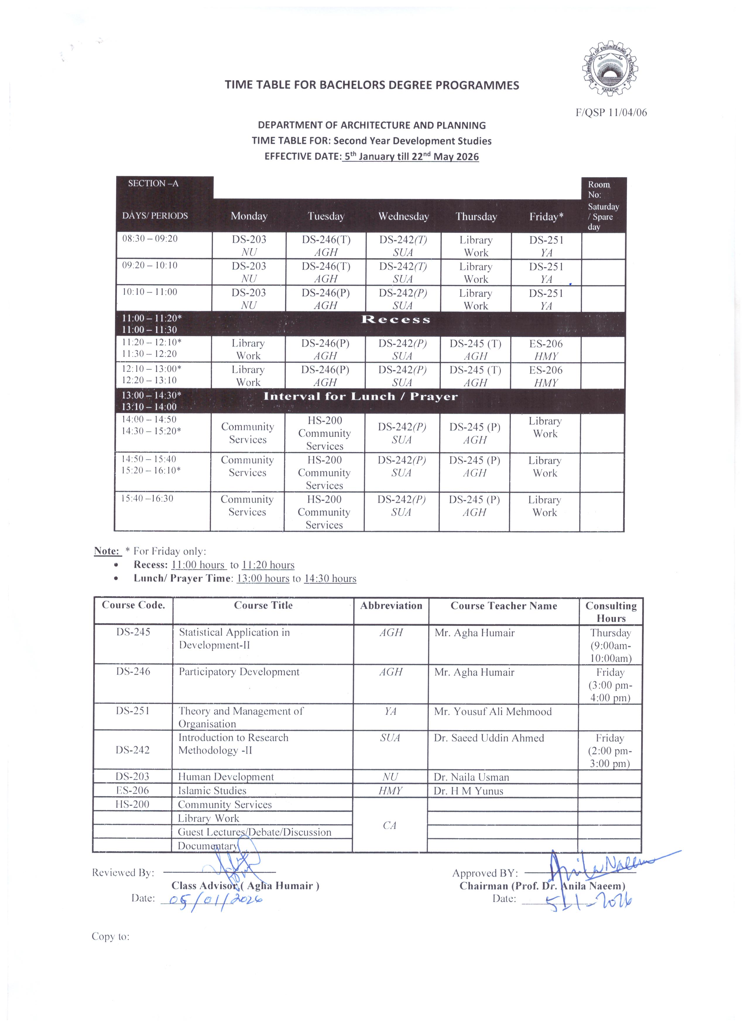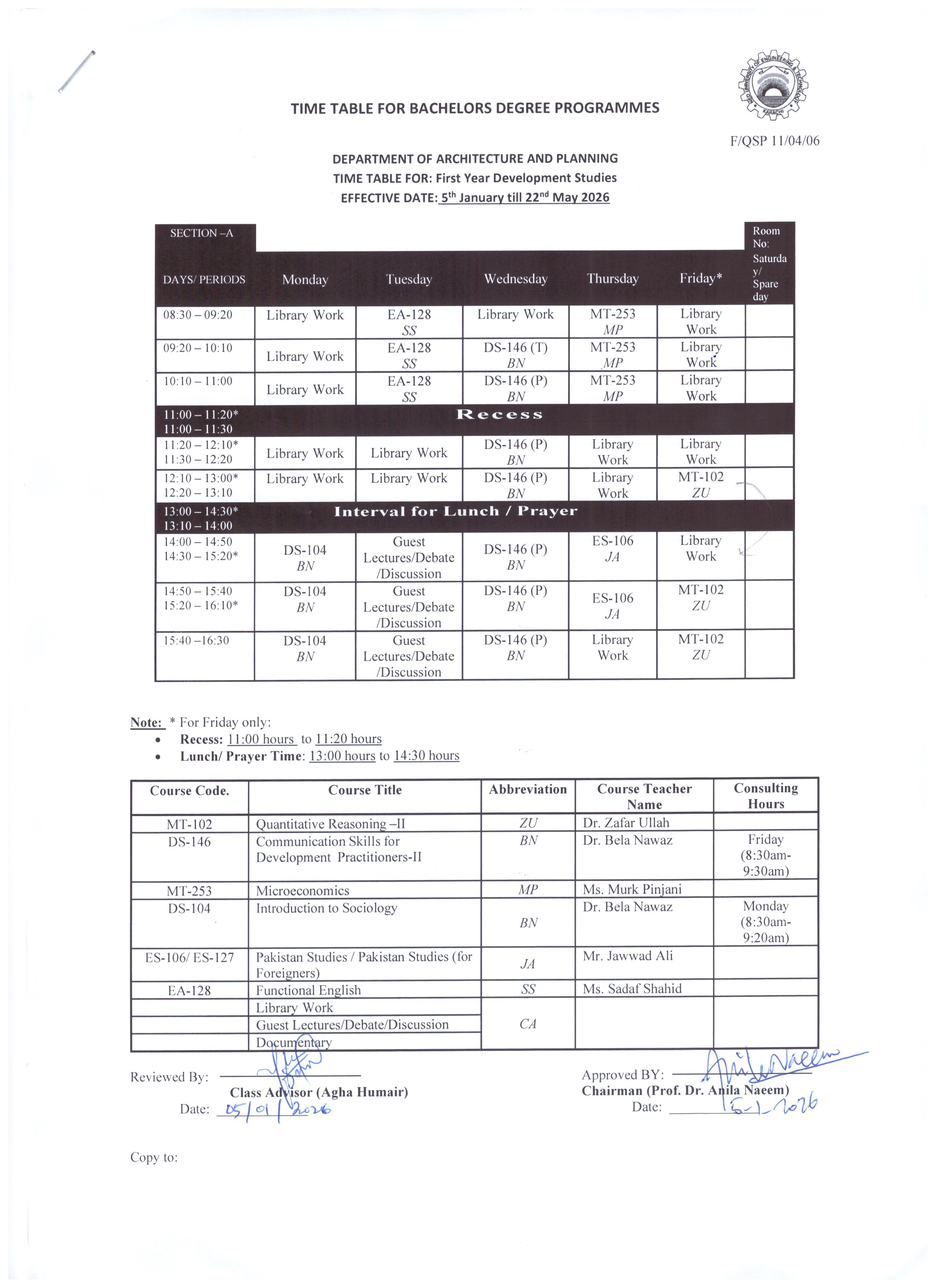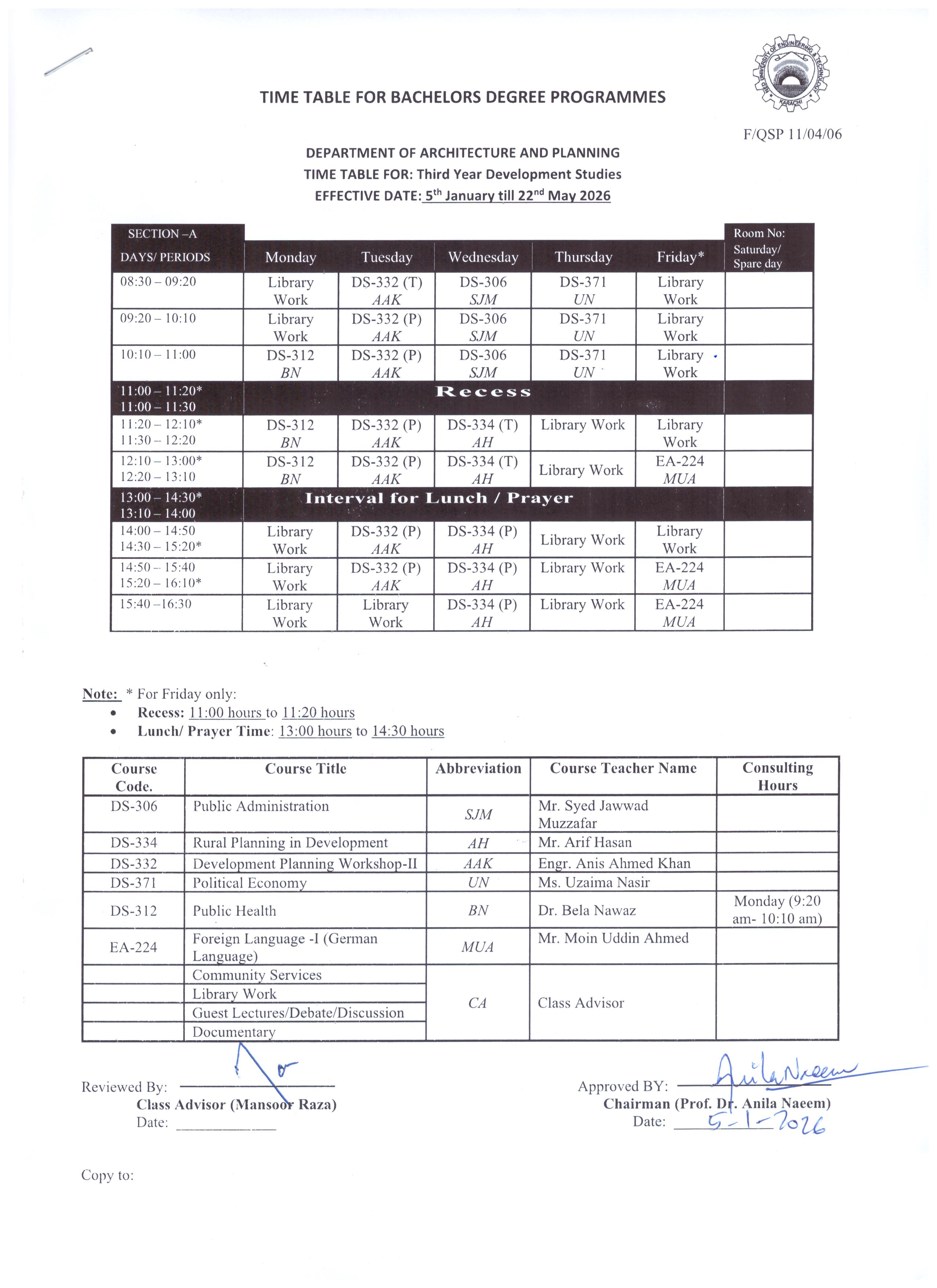 Bachelors Programme Timetables for Spring/ Fall-2024 Masters Programme Timetables for Spring/ Fall-2024 B.Arch – Architecture First Year Second Year Third Year Fourth Year Final Year BS – Development Studies First Year Second Year Third Year Final Year M.Arch – Architecture Timetables for Spring/ Fall MURP – Urban & Regional Planning Timetables for Spring/ Fall [Academic Calendar 2024-2025] [Academic Calendar 2024-2025]